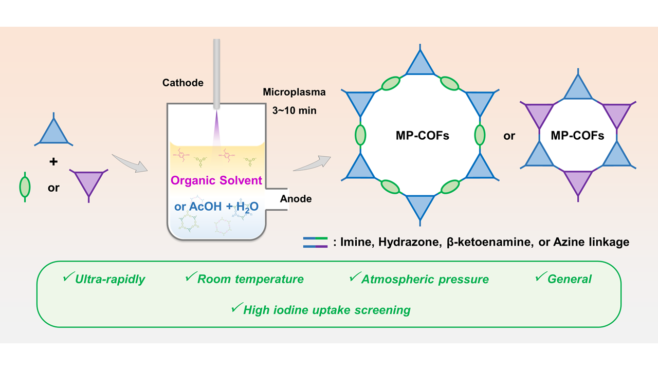 INET researchers have developed a rapid microplasma electrochemistry (MIPEC) method for synthesis and screening of COFs for highly efficient iodine capture. A series of flexible imine-bond COFs with various monomers in minutes at room temperature,which showed 1000-fold higher space-time yield than solvothermal method.This approach also achieved the preparation of COFs with diverse linkages and four types of imine-based COFs were successfully synthesized in aqueous acetic acid, which avoided the use of harmful organic solvents, indicating that microplasma method is green and versatile for COF synthesis. The generation of ROS reactive oxygen species induced by plasma is a key factor driving the reaction, while the crystal regulation of water synergistically ensures the high crystallinity of COFs. The obtained COFs showed higher surface area and exhibited superior performance in volatile iodine uptake. After screening more than ten types of COFs, the iodine adsorption capacity could be promoted from 2.81 to 6.52 gg-1. The results in our work indicated that, for MP-COFs with the same monomers, the better crystallinity and larger surface areas of those COFs were profit to the diffusion of iodine molecules and provides more binding sites, leading to the enhanced adsorption performance. For MP-COFs with the distinct monomers or structures, the chemical adsorption effects overweighed the influence of physical structures.