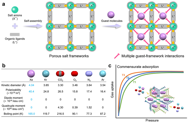 The strategy of guest polarizability-directed commensurate “freezing” of noble gases within porous salt frameworks could be applied in challenging Xe separation from the spent fuel reprocessing off-gas. Guidance is established for the design of advanced porous materials to address the trade-off between adsorption and selectivity. This work was published in the Angewandte Chemie International Edition, with the title "Guest Polarizability Directed Molecular "Freezing" Within Non-metal Porous Salt Frameworks", and was selected as a Very Important Paper.