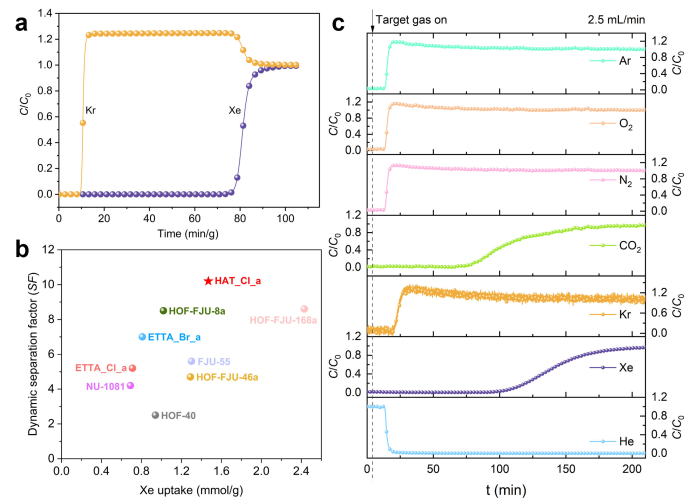 活化后的HAT_Cl_a框架对具有高极化率的Xe表现出独特且与温度无关的“相称吸附”行为,在253-298 K范围内,Xe吸附量稳定在1.91-1.98 mmol/g,接近单位晶胞容纳2个Xe原子的理论极限。而对极化率较低的Kr则呈现传统热力学吸附行为,Kr吸附量随温度升高显著下降。这种吸附行为的差异使HAT_Cl_a在模拟空分副产物(Xe/Kr = 20/80, V/V)分离中达到了1.47 mmol/g(迄今最高)的Xe吸附容量和创纪录的高动态分离因子(10.2),突破了传统吸附材料在Xe/Kr分离中难以同时实现高吸附容量和高选择性的限制。在室温下Xe含量约为400 ppm的低浓度多组分模拟核废气混合气体柱穿透实验中,尤其是在CO2强竞争气体存在条件下,该材料仍对Xe仍保持90分钟以上延迟穿透,且对Xe的吸附容量可达12.6 mmol/kg,表明其在Xe/Kr分离领域的应用潜力。理论计算表明,尺寸匹配的离子通道中的强限域效应及多重强Xe···Cl极化作用力的协同作用是驱动Xe的独特吸附以及Xe/Kr高效分离的关键。