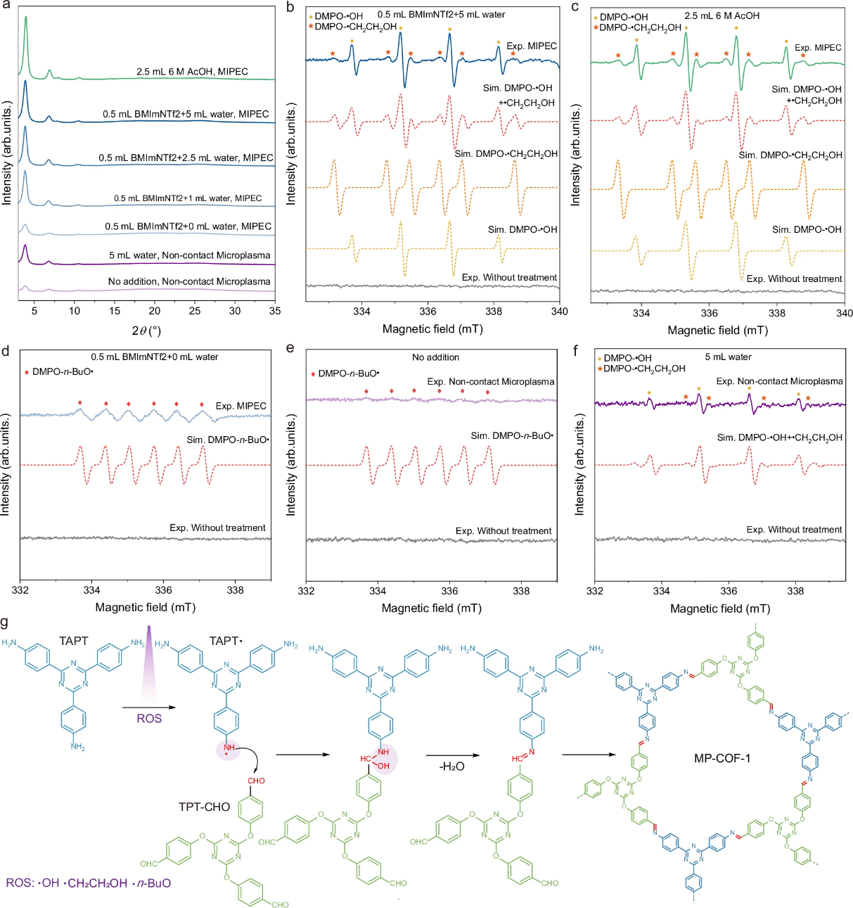 通过合成机理研究实验发现微等离子体诱导的ROS活性氧自由基生成是驱动反应的关键因素,而水的晶体调控作用则协同保障了COFs的高结晶度。微等离子体与溶液界面作用产生的高能活性物种(如OH、CH₂CH₂OH、BuO等活性氧物种ROS),可激活单体生成自由基(如 TAPT),显著降低C-N键形成的能垒,促进COFs快速成核;同时,体系中的水分子提供了大量的OH有利于单体活化,同时可调控醛胺缩合反应的可逆性,通过缺陷修复提升晶体有序度。