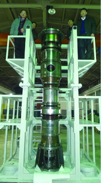 (2)氦气透平 在“高温气冷堆氦气透平发电系统”(HTR-10GT)中,氦气透平压缩机组工作于高温密闭氦气环境,机组转子需要越过两个挠性临界转速以达到工作转速15,000r/min。传统轴承难以满足核反应堆一回路特殊环境下对大型重载高速挠性转子的支承要求,因而采用磁轴承支承方式被认为是唯一现实可行的解决方案。由于磁轴承是一种新兴技术,国内外在大型工程中的应用实例为数不多,在核能领域里的应用国际上目前尚无先例,为保证氦气透平机组转子安全、可靠地运行,顺利通过二阶挠性临界转速,需要深入开展一系列相应的理论和试验研究。当今只有极少数几个国家在实验室条件下完成了过临界试验,而在大型工程应用中超越二阶挠性临界转速目前还是空白。 研究室集合结构设计、转子动力学分析、系统辨识、自动控制、传感器、电力电子技术等诸多学科的人才集中攻关,成功攻克了挠性转子在可控状态下超越二阶临界转速的难题,完成了氦气透平电磁轴承系统的设计与样机研制。
